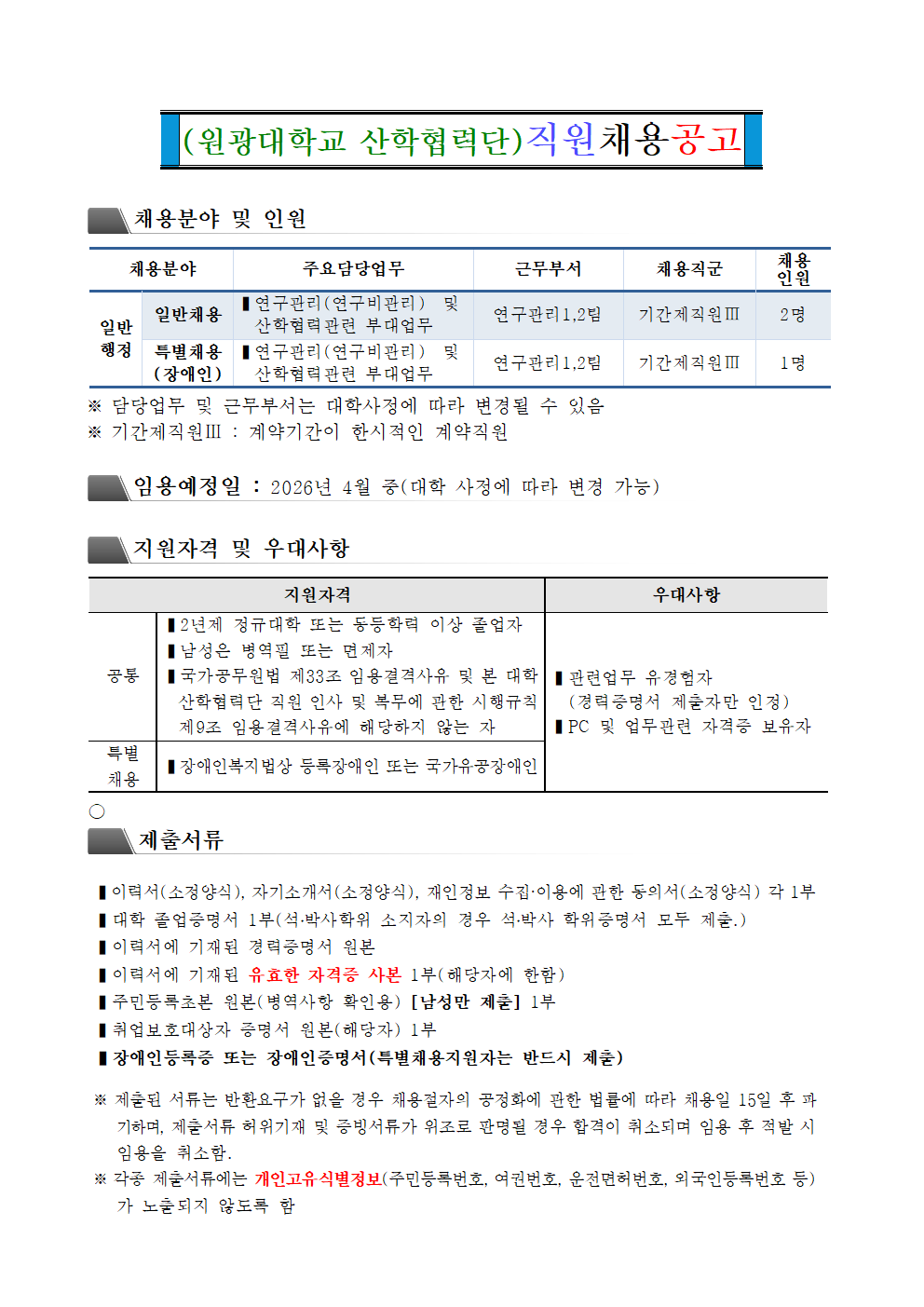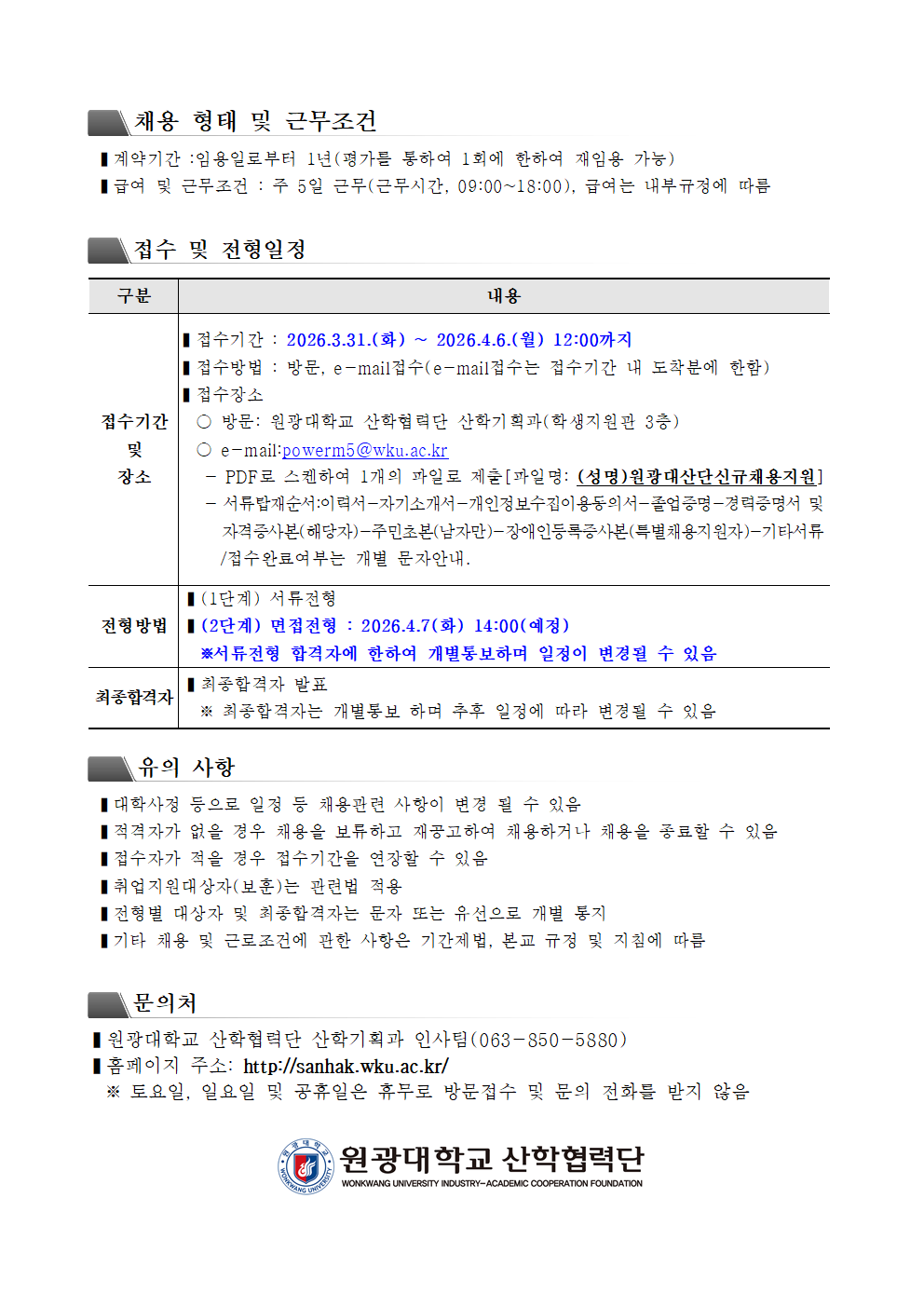 (원광대학교 산학협력단)직원채용공고 (접수기한 3월 31일 ~4월 6일 12시)