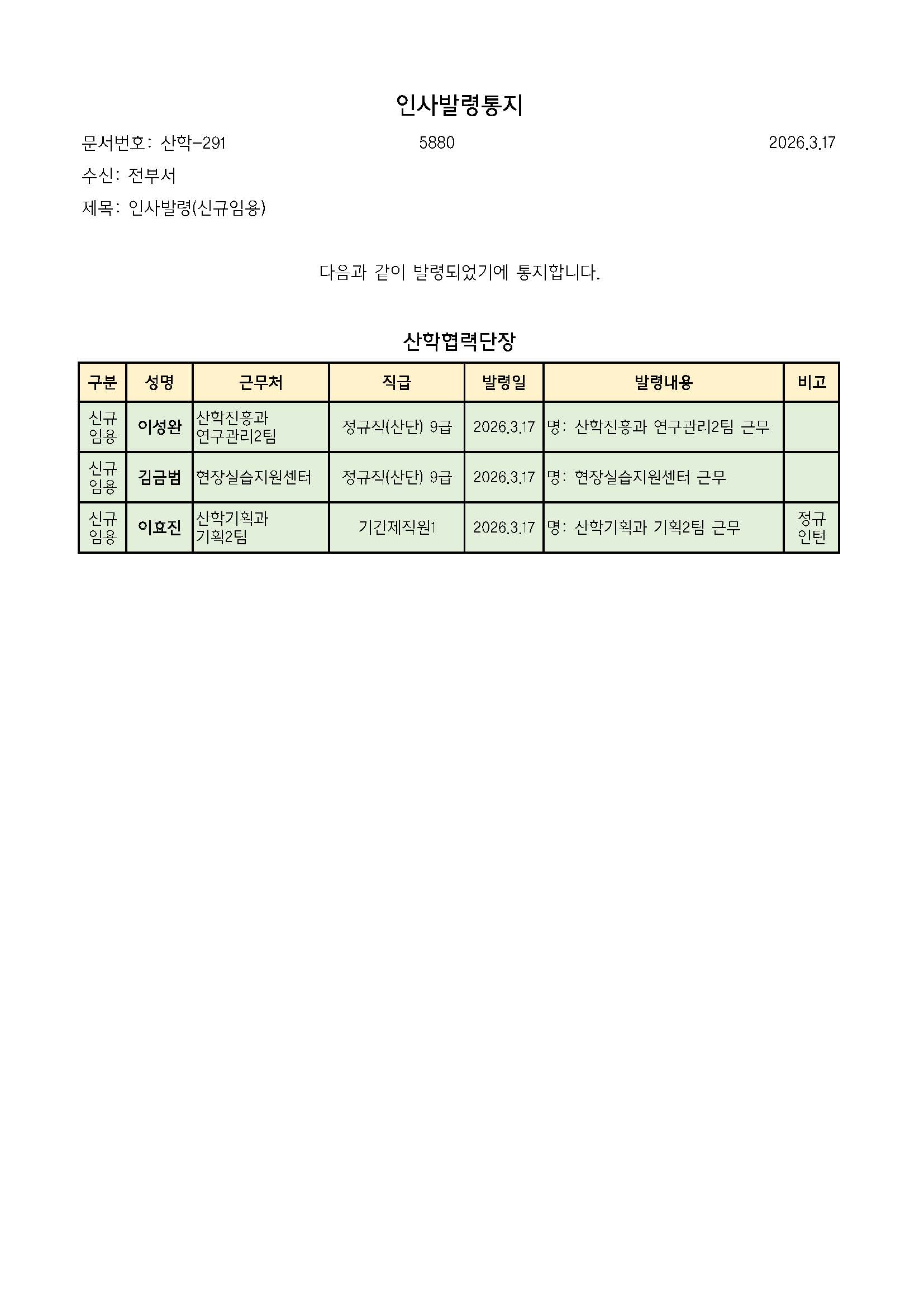 인사발령(신규임용)